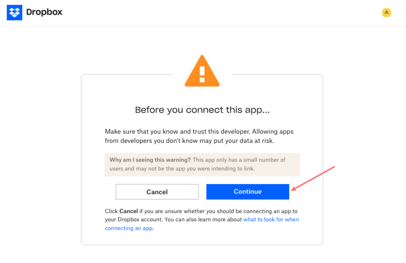 Now, your site will redirect to Dropbox. Here, click the **Continue** button to proceed with the process.