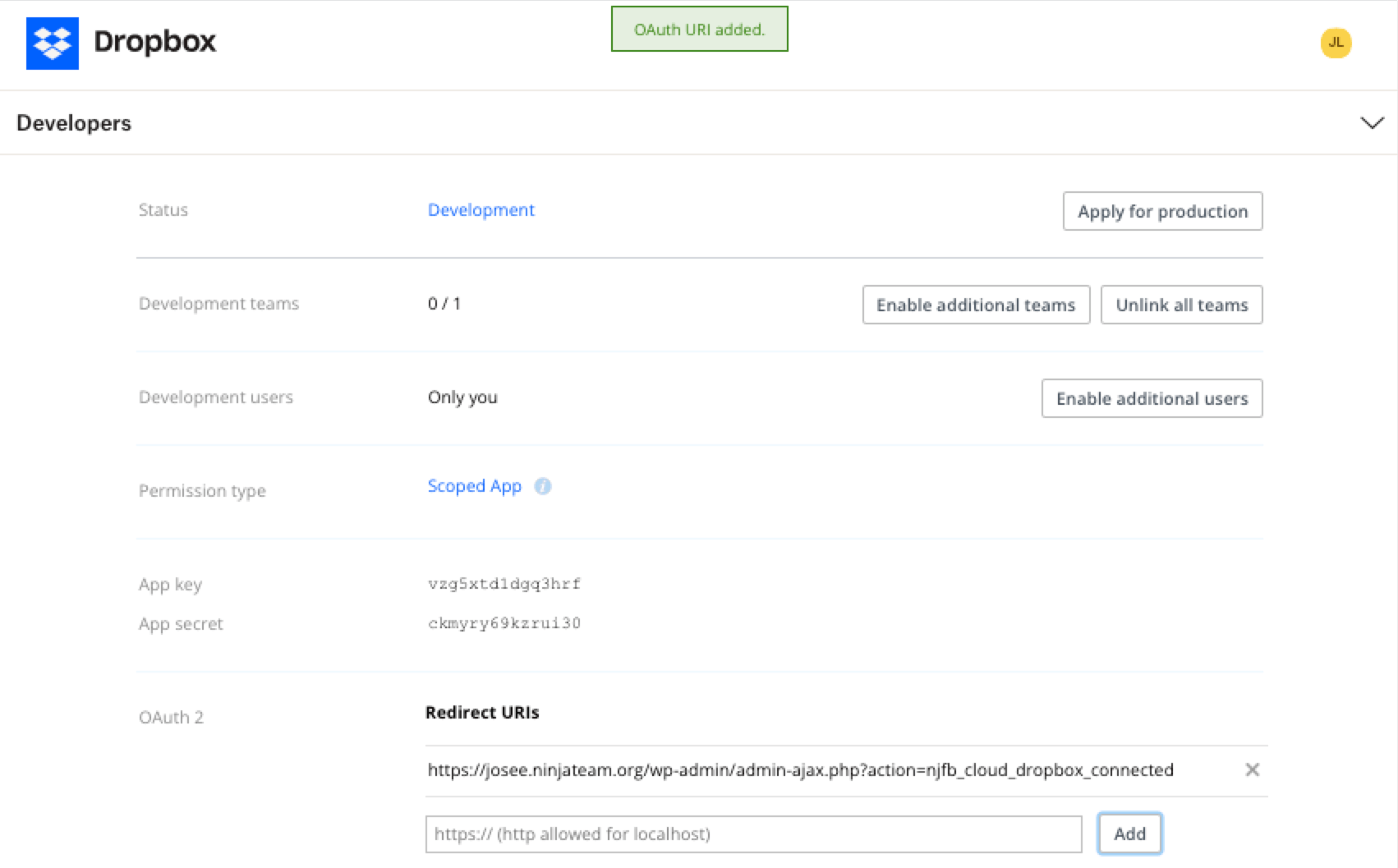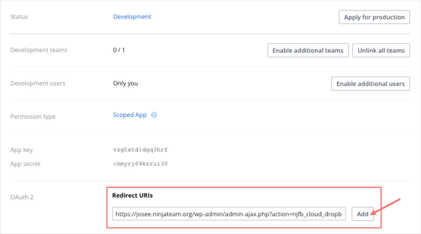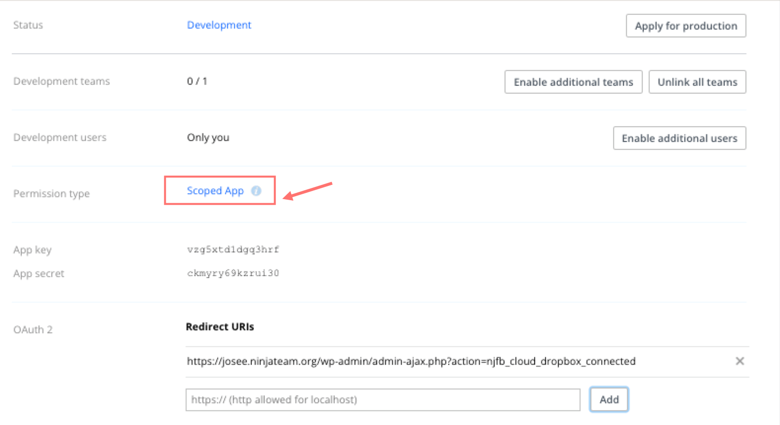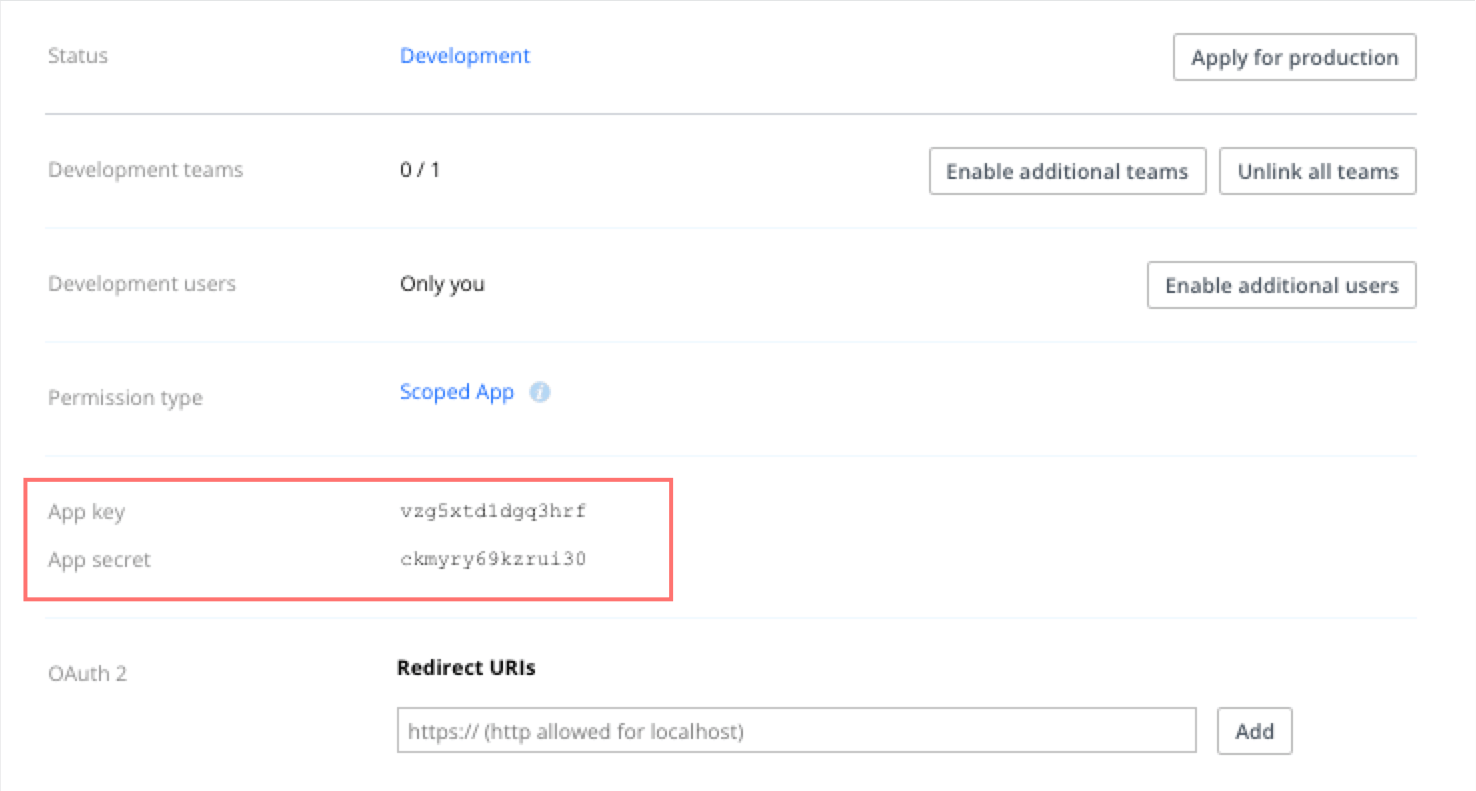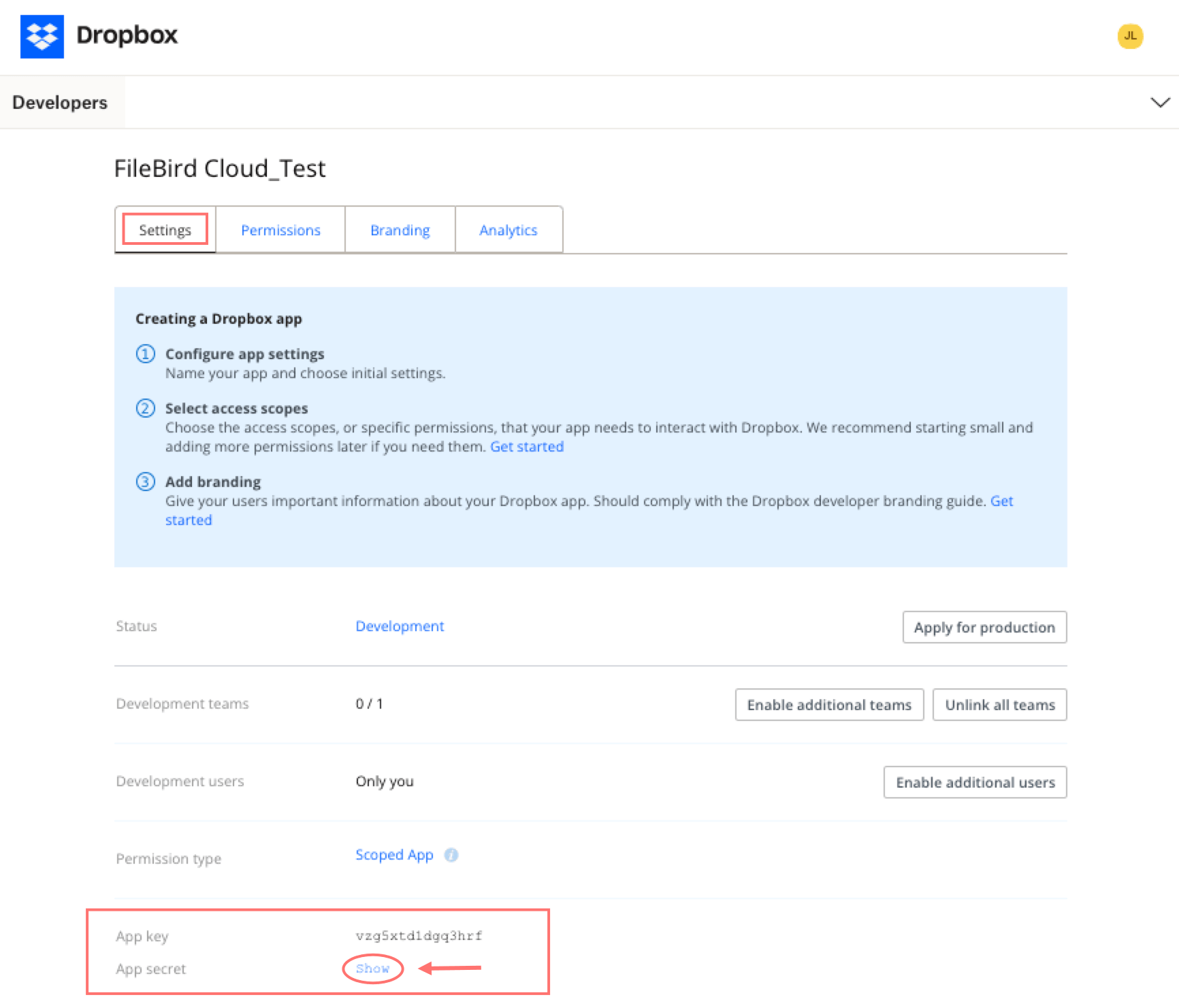 Dropbox will automatically redirect you to the settings section, where you’ll find the API key and App secret code. Click **Show** to display the hidden code.