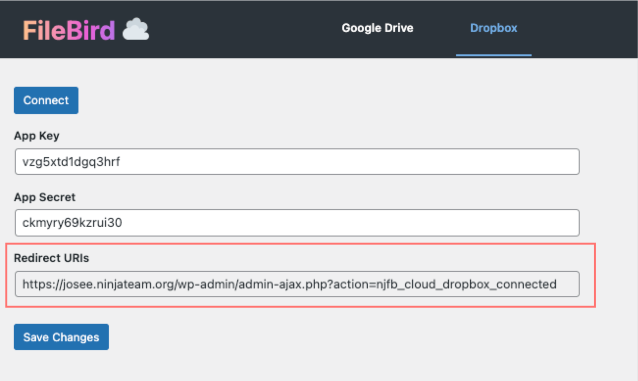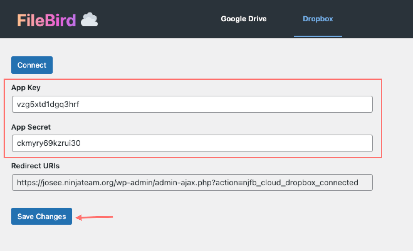 Choose the **Dropbox** tab, and paste the API key and secret code into the corresponding fields here. Then click **Save Changes**.&#x20;