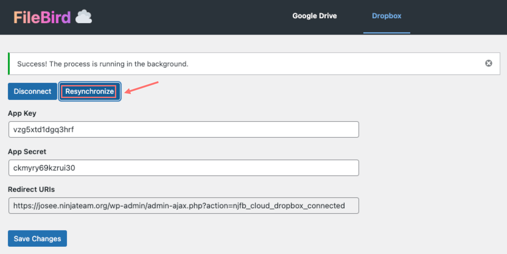 Return to the **FileBird Cloud** panel again. Click **Resynchronize** to synchronize your folders and images from Dropbox to the FileBird folder tree.&#x20;