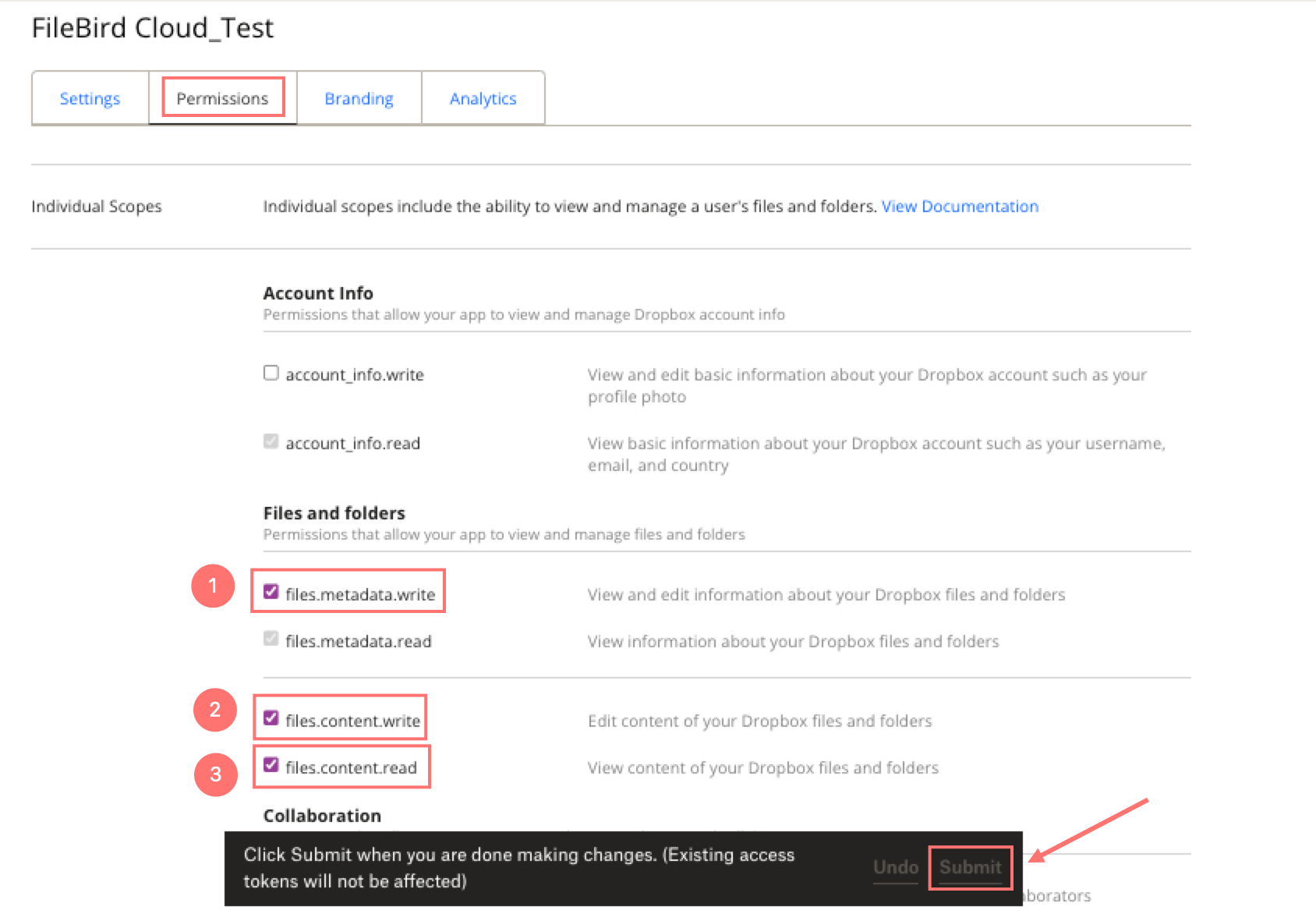 These permissions allow your app to view and manage files and folders. Therefore, to grant them, check the boxes as follows: