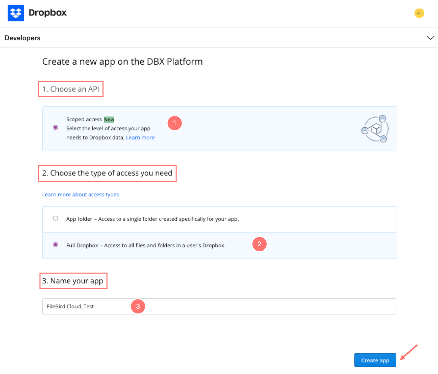 Next, click on **Scoped App**. Dropbox will automatically take you to the **Permissions** tab.