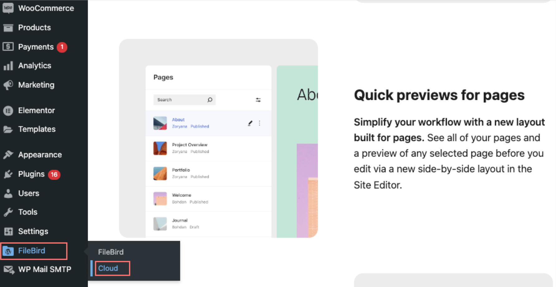 Return to your site. After downloading and installing the **FileBird Cloud** plugin, you will see FileBird appear on the toolbar in the dashboard. Navigate to **FileBird > Cloud**.