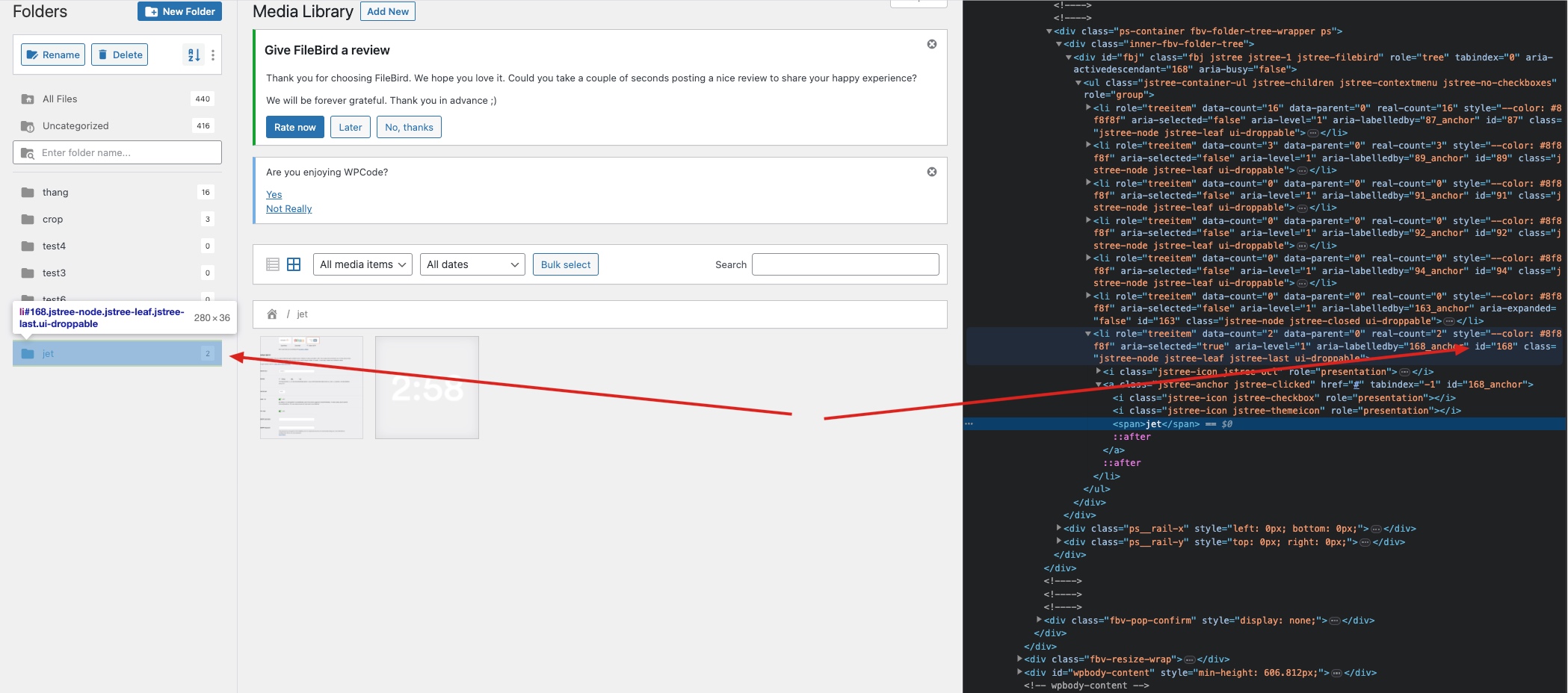 4. Add the functionality to integrate FileBird with JetEngine Form. You might use WPCode or add it to the theme functions.php